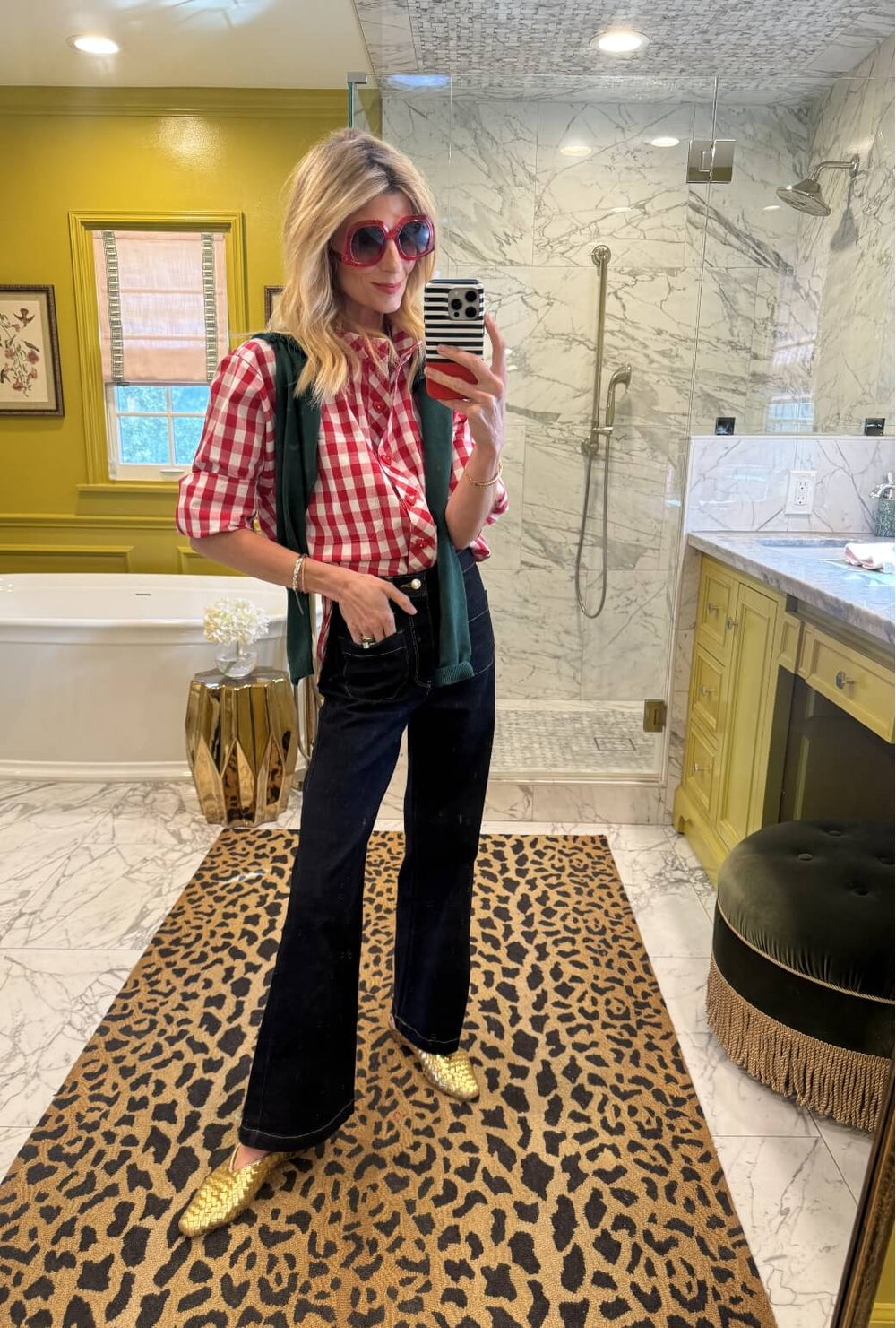 The easiest casual look for December. Tuck the Mandarin Shirt into our dark denim Patch Pocket Jeans and drape the Carlyle Sweater in Deep Green over your shoulders for a pop of green.