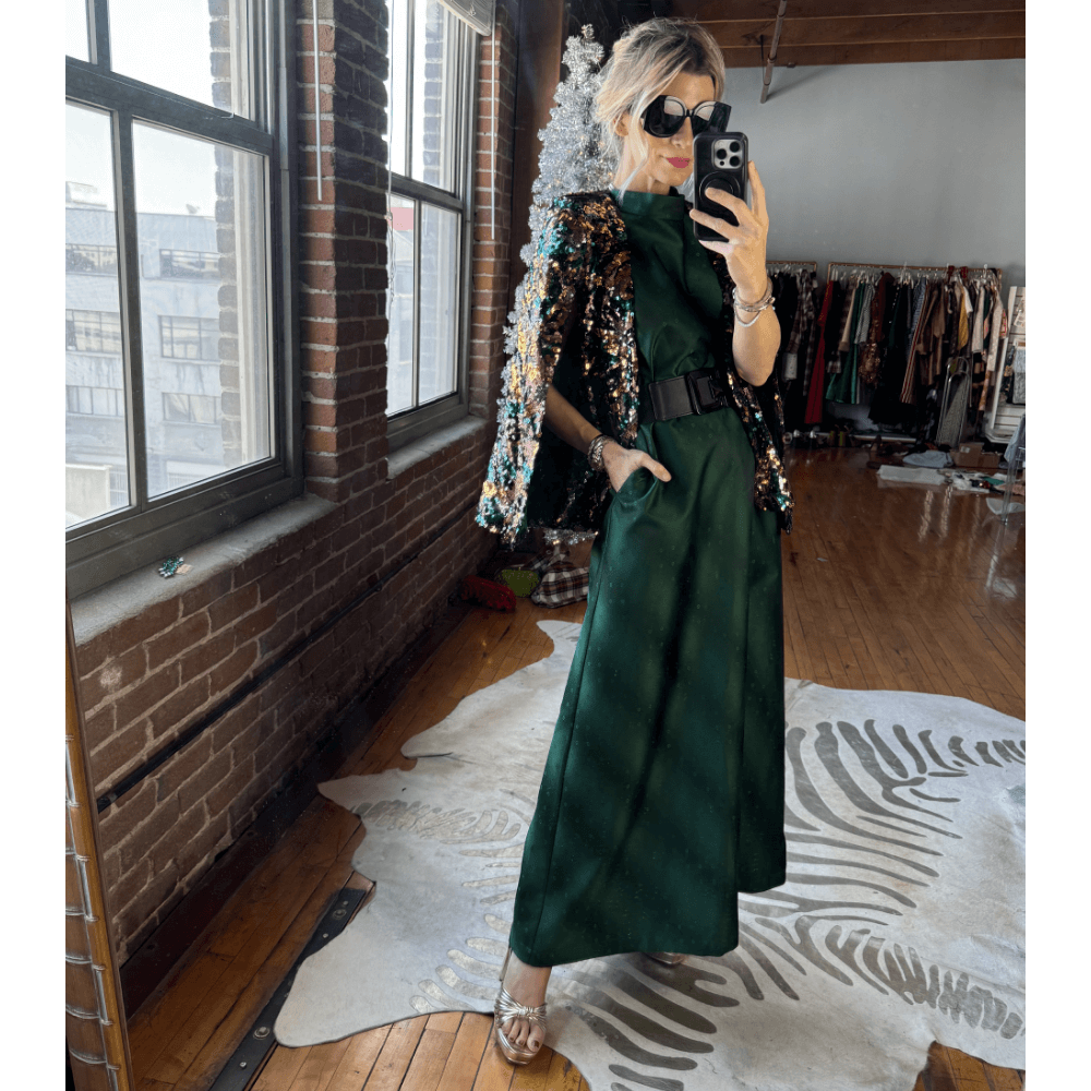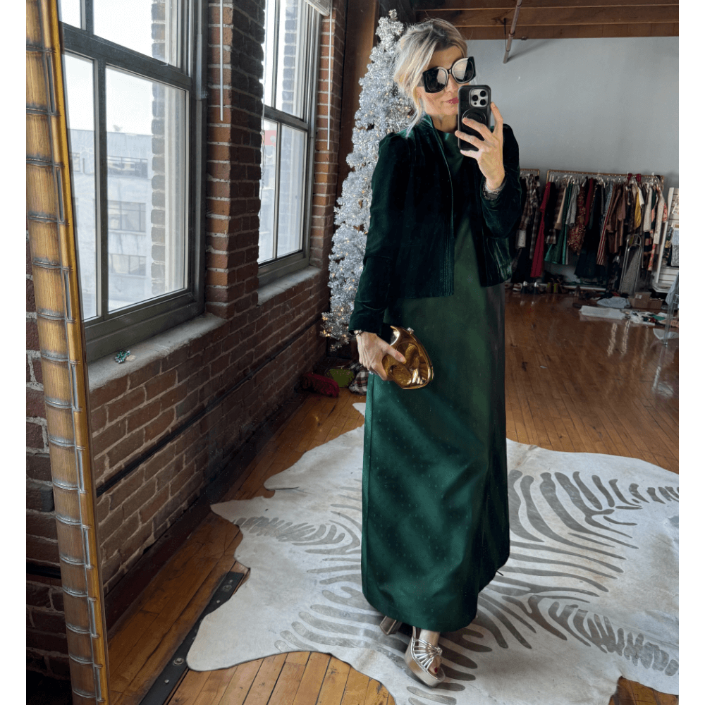 The Mona Lee Blazer is the perfect tonal complement over the Maxi Mod Dress. And we love how the gold accessories truly pop when paired with the deep greens of these two pieces.