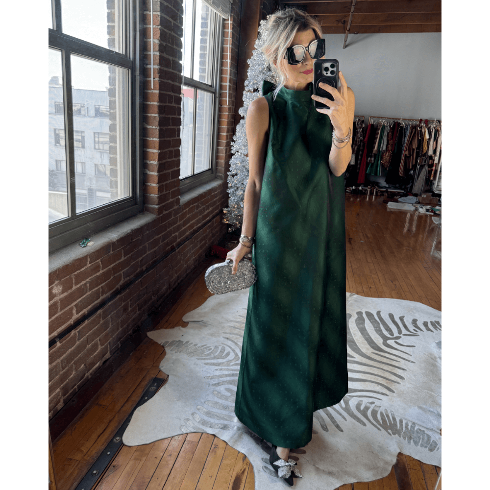 Some occasions in life - especially around the holidays - call for a dramatic gown silhouette and this Maxi Mod Dress with a detachable bow in the back is just the ticket! In a luxe emerald-hued jacquard with a slight ombre effect, she can be your special occasion ace in the hole. With fully functional buttons in the back and an A-line silhouette, she's stunning and easy to wear.