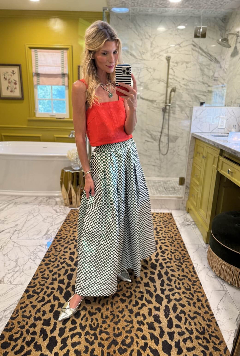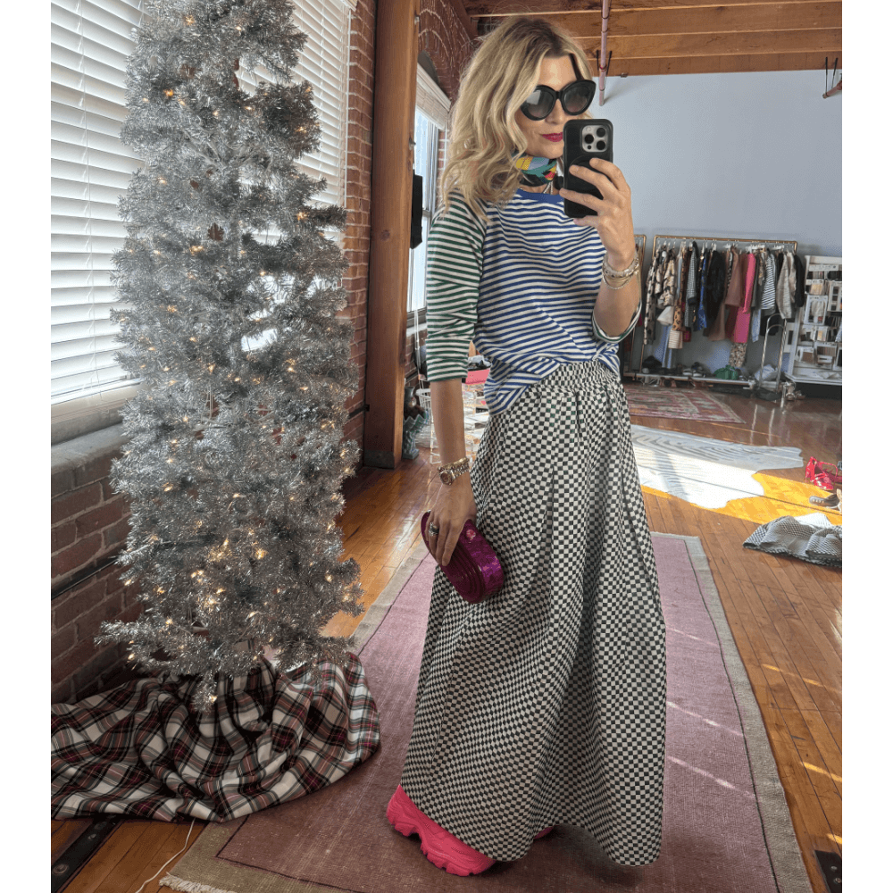 A skirt that can go from errands to elegant is really all your wardrobe needs, right? Made with an elastic waist, in a machine washable fabric, and WITH pockets—this shimmery checkerboard beauty is a wardrobe must have. She has a retro vibe when paired with her matching Pillar Top, but you can easily change her up with a sleek turtleneck or crisp white button down.