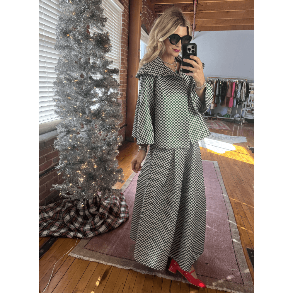 Add the cropped Grace Coat with the Maxi Party Skirt in this shimmery checkerboard fabric for a bold look for your Holiday Party.