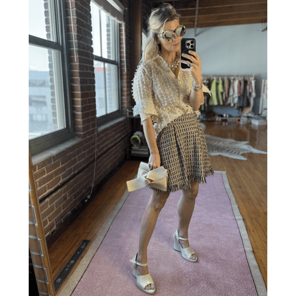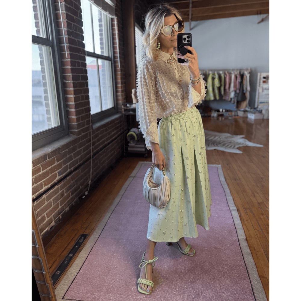 Perhaps the most classic piece in any wardrobe is a neutral button down top. From evening out to everyday, there are endless ways to style them. When we stumbled upon this ivory fabric with small bow detail, we just knew it would make the most darling button down with a whimsical twist. She's lightweight and sheer and makes a great layering piece - we love her with the celestial mint pieces for a dreamy pastel color palette.