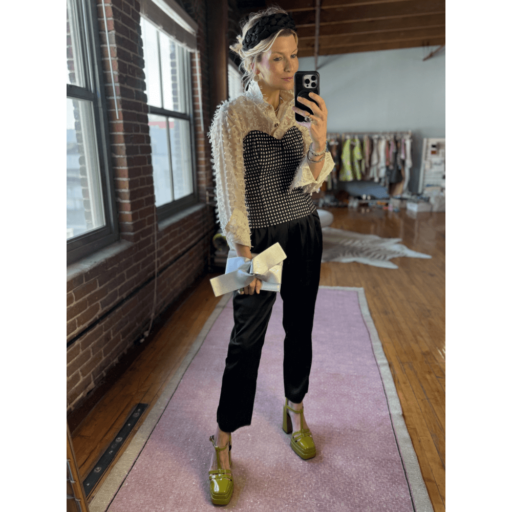 Unexpected layering can really dress change the look of pieces you may already have in your closet. In this look, we've styled the Mel Button Down under a bustier with our satin pants and platform heels for a cocktail-ready ensemble.