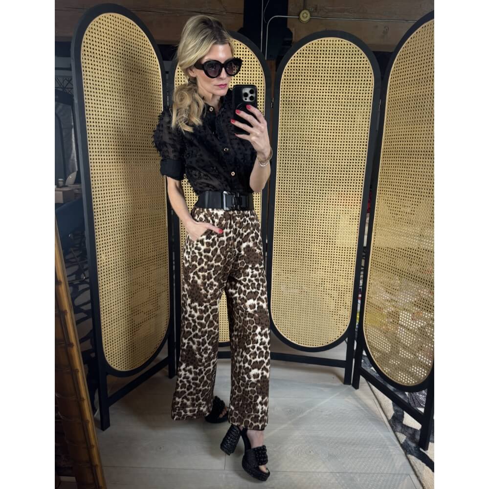 Dress up the cheetah Wide Leg Knit Trousers by adding a dressy blouse and defining the waist with a coordinating belt. This color palette of black and classic animal print is sophisticated and easy to pull together.