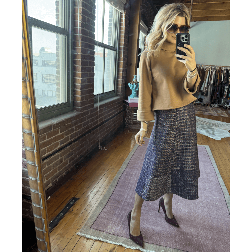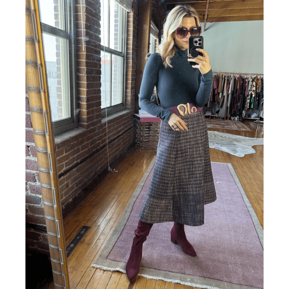 Pull from the blue tones in the tweed and pair the Midi Guest Skirt with our slim fit turtleneck. Color coordinating accessories - Snake Bite Belt and Over-the-knee boots - finish this look in a timeless way.