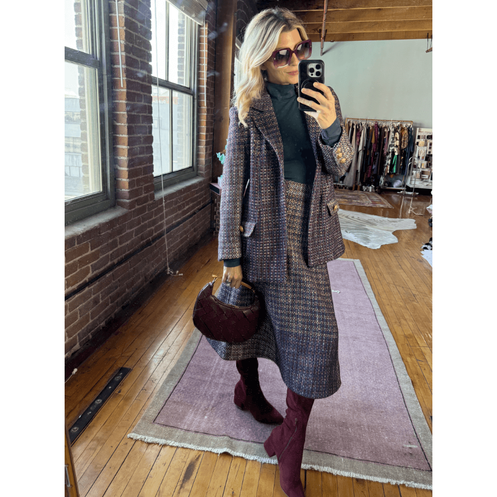 A timeless, American look...this matching MIDI Guest Skirt and Boyfriend Blazer with a slim fit turtleneck underneath will never go out of style. Add the over-the-knee boot for a color coordinating finish.