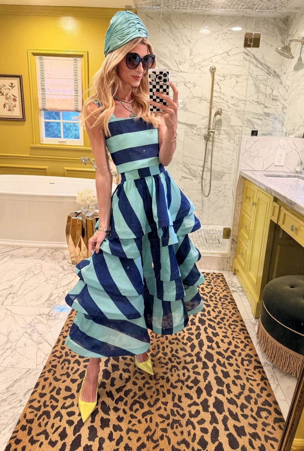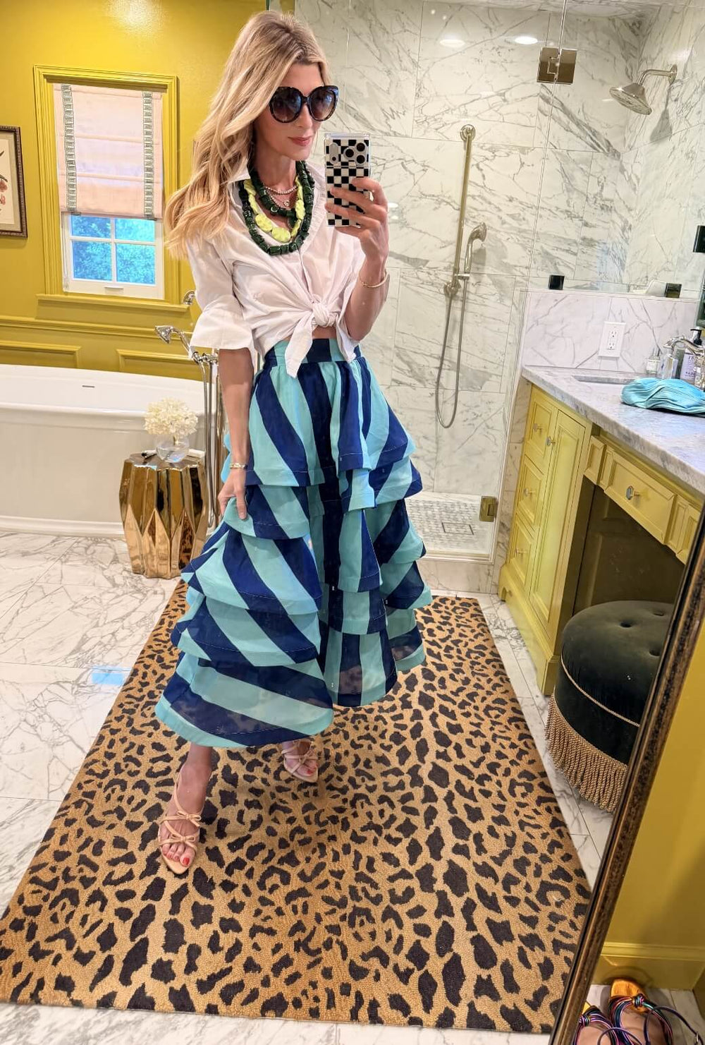 Layers of necklaces pair with the layers of silk in the Teagan. A crisp white button down is a lovely anchor for the look.