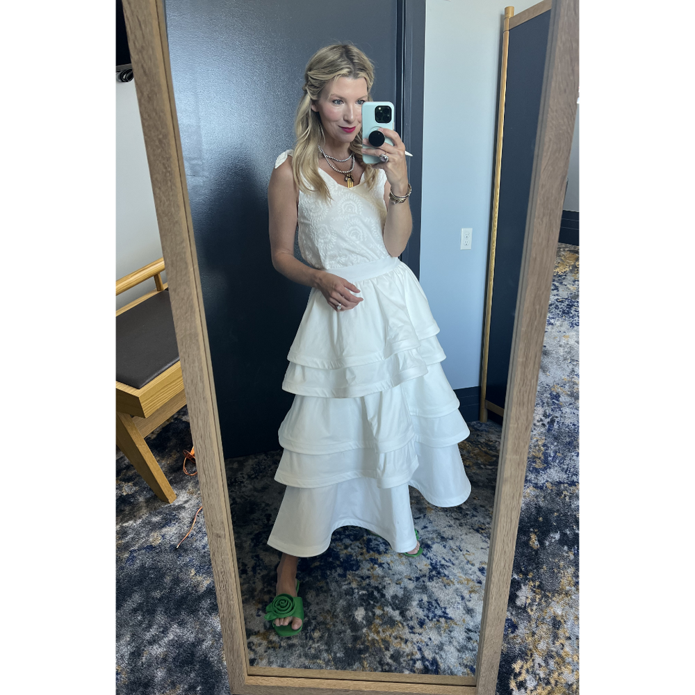 Styled our white embroidery tank with our white cotton Teagan. Perfect all white look!