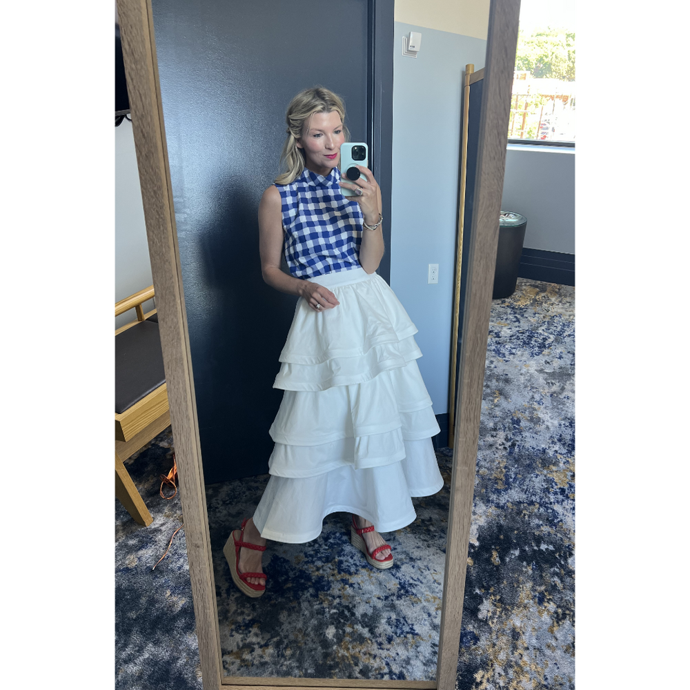Such a cute Summer look with our blue/white gingham tunic top and red espadrille sandals!