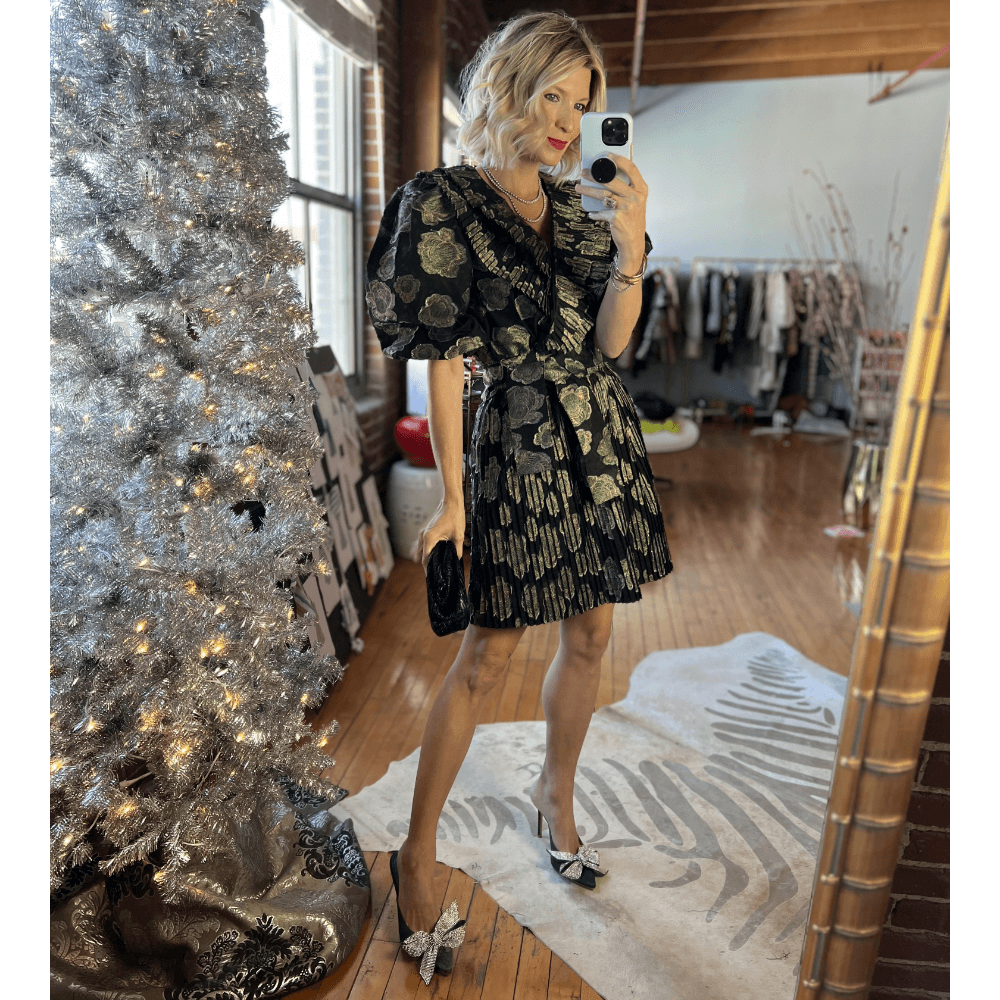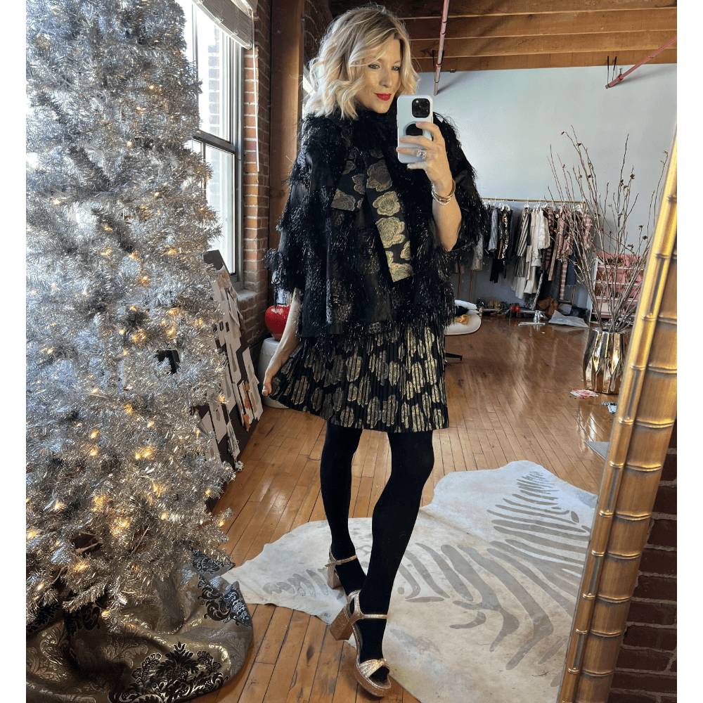A little bit over the top, a lot o' bit fabulous. Adding black tights, our Rose Gold heels and the Black Eyelash Car Coat makes a striking ensemble for your Holiday occasions.