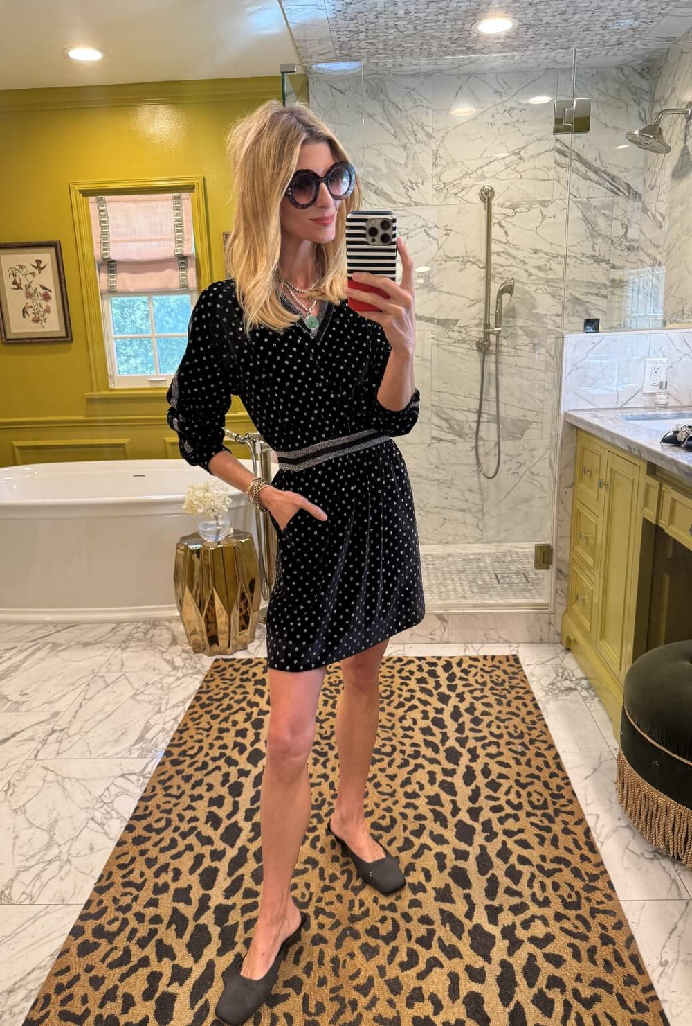 Inspired by 1980's "activewear", our best-selling Track Dress is a no brainer for getting out the door in comfort and style...and now she's available in a mini! Crafted in soft black velvet with sparkly polka dots, this little number is perfect for a casual holiday party or a just a day about town that needs a little pizazz! Sneakers keep her easy, ballet flats dress her up a bit - either way you'll feel festive, fun and, most importantly, comfortable!
