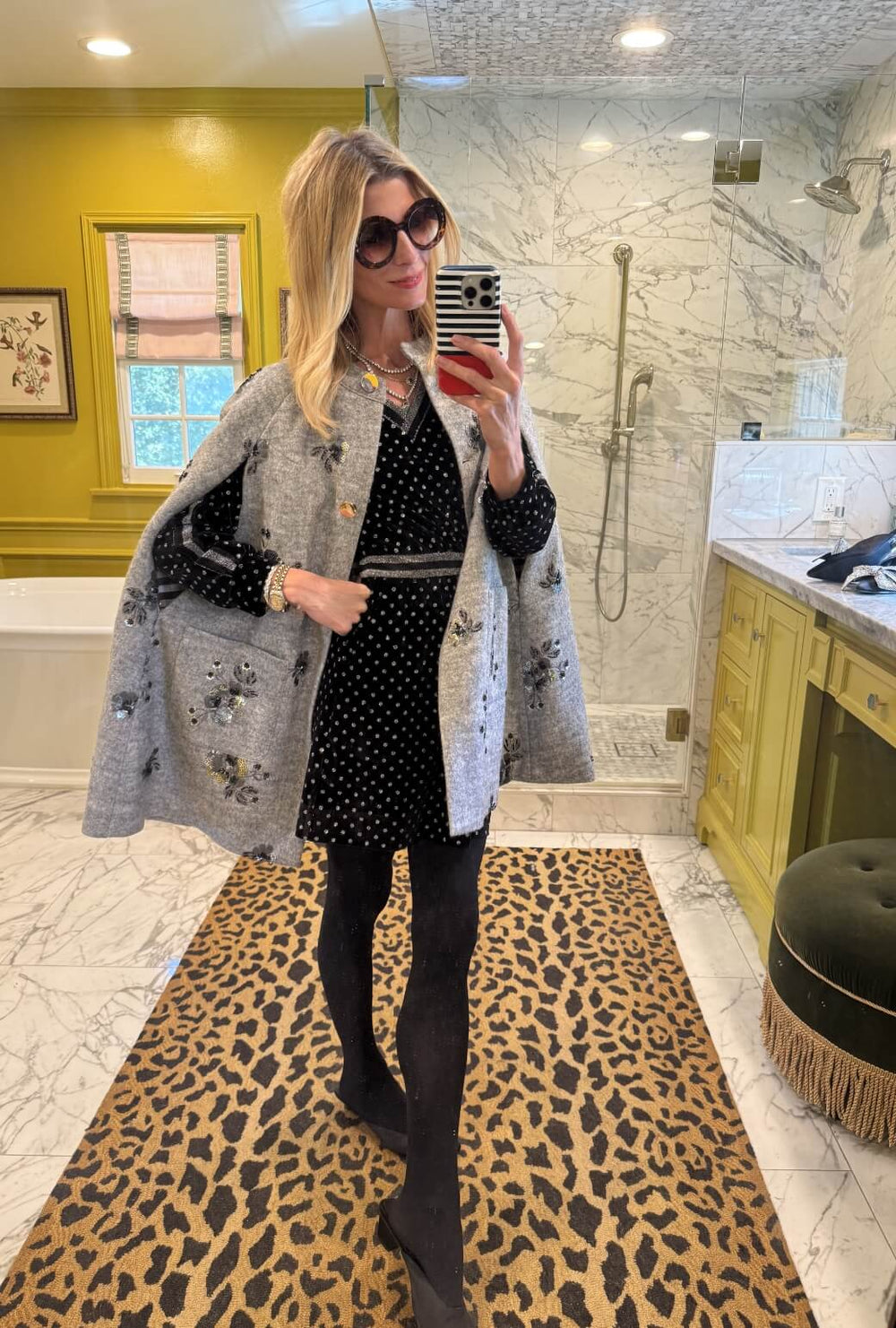 Chilly outside? We have you covered. Pair our velour track dress with the coordinating Le Cape and black tights for volunteering at school, a chic work look, or cocktails with the girls.