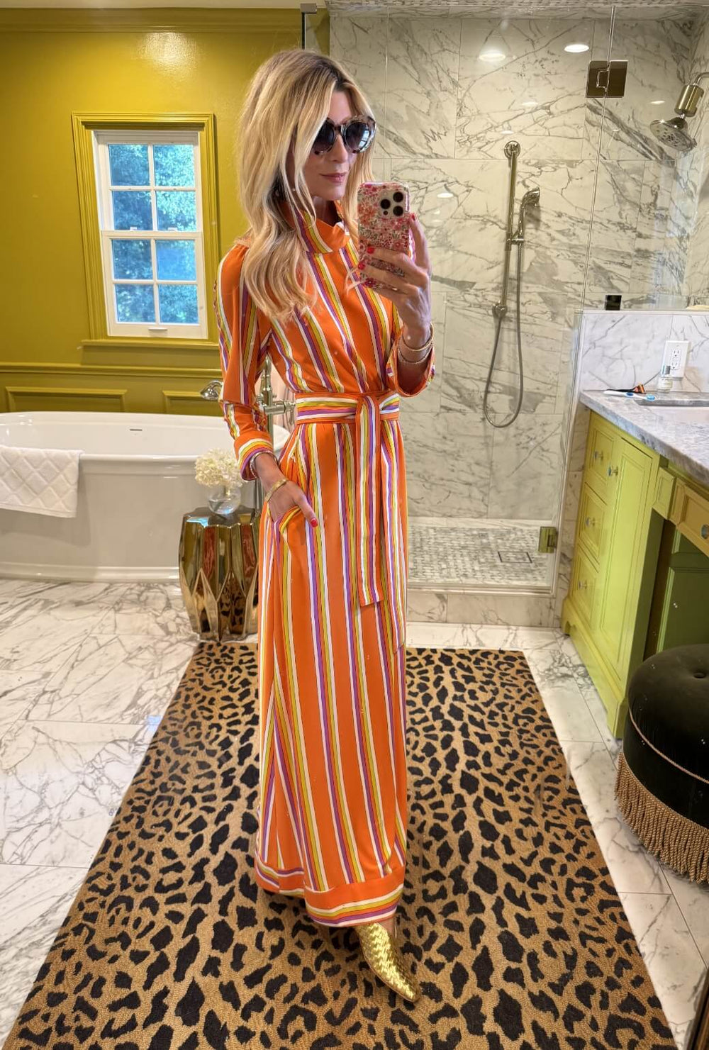 Ever dreamed of waltzing into the most glamorous event in your nightgown? With our Mod Kaftan, your dream comes to life. This soft and striking kaftan features buttons down the back, hidden pockets (yes, please!), a self-tie belt, and a fabulous retro orange stripe knit. She’s the kind of statement piece that feels instantly special. Easy glamour? Absolutely.