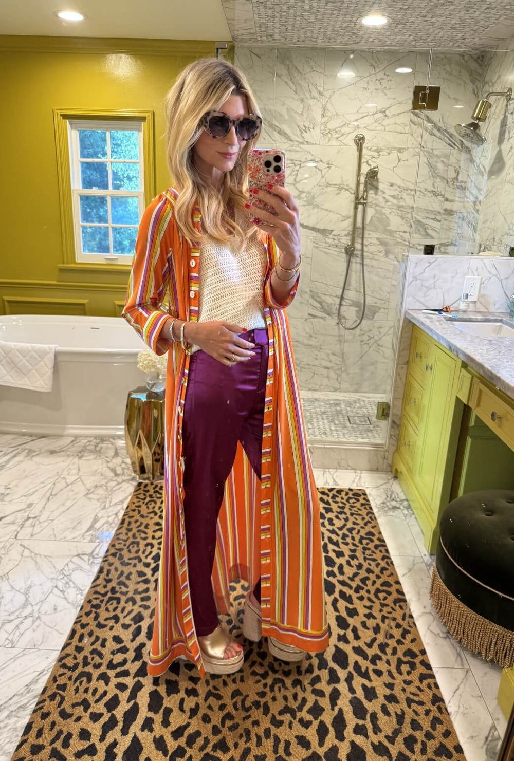 To change up the Kaftan completely, flip it around with buttons in front to wear as a duster. Our Rani Pink Satin pants and Sleeveless White Sweater create an easy base for this look.