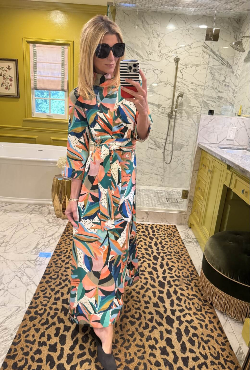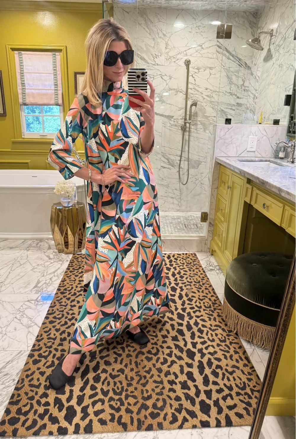 Fancy leaving your house in your nightgown? Well then, consider this Kaftan a wish granted. Soft, elegant and statement making, this Kaftan featuring buttons down the back, pockets, a self belt and a colorful palm print is something we all deserve to own.