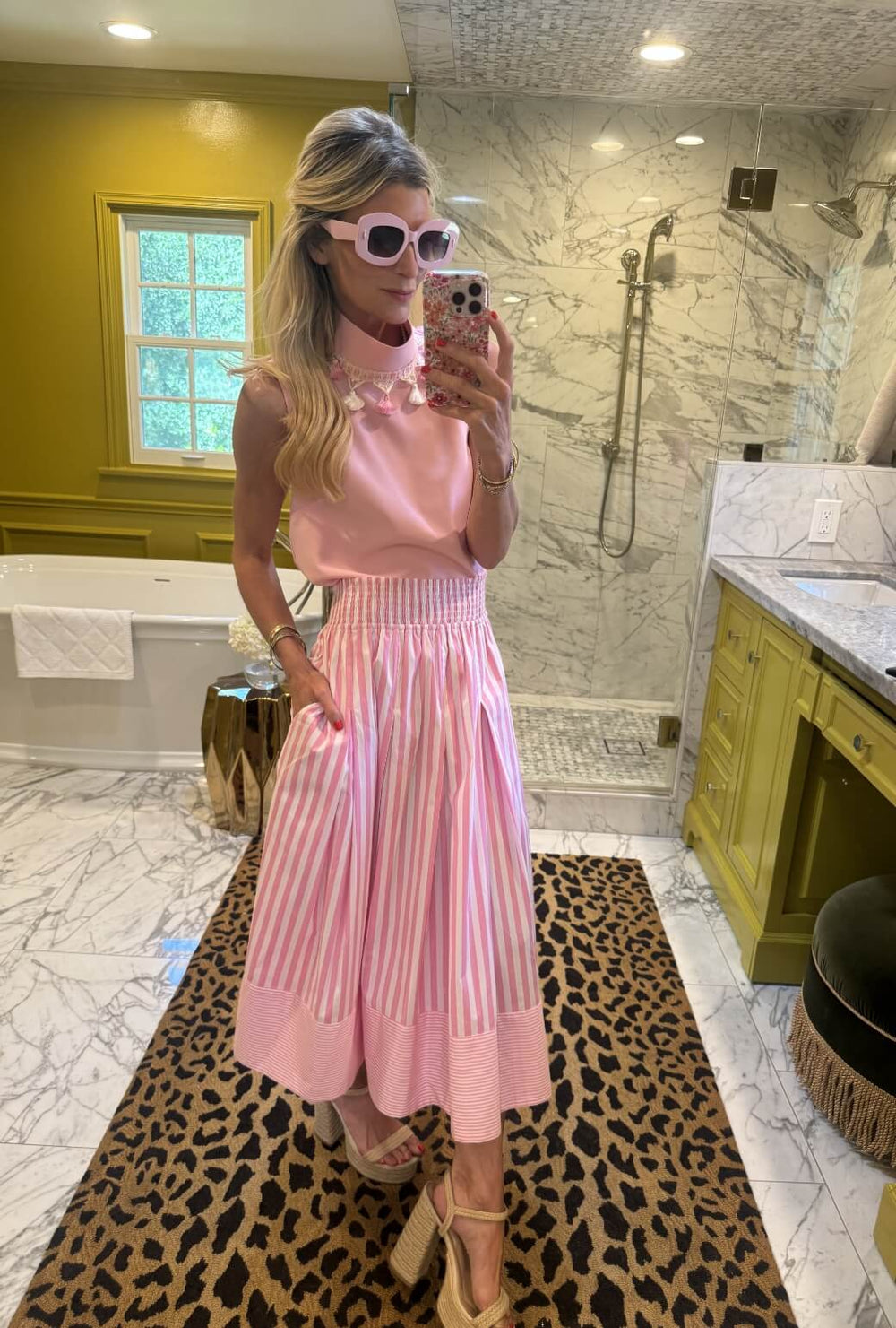 She’s the perfect topper for our smocked waist pink stripe skirt, blending vintage flair with everyday ease. Elevate your look while staying comfortable and pulled together.