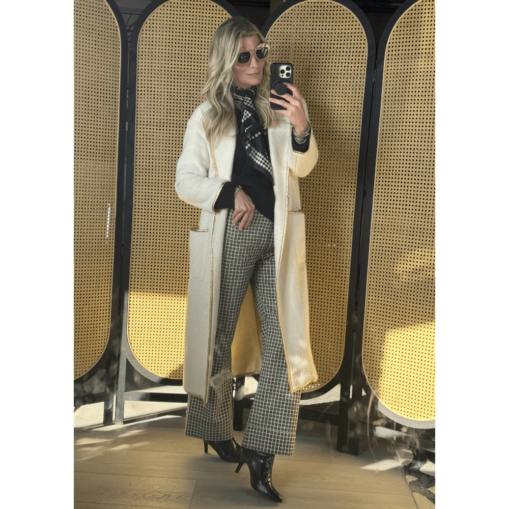 Your next cozy winter coat is here! With an open front design, this easy, throw-on-and-go Car Coat is the perfect wardrobe staple for the colder seasons. Crafted in an ivory wool blend trimmed in gold, she is the perfect balance of classic and cool. Style her with jeans and a classic button down or toss her over a jazzy holiday look. And did we mention, she's roomy enough so you can comfortably wear a chunky sweater underneath?