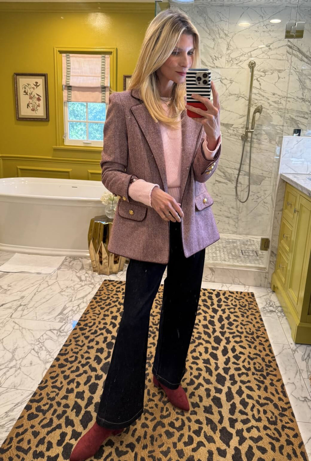 For an office look, pop on a sweater and layer a blazer on top. We love it with our "The Jumper" in Barely Pink and our herringbone Boyfriend Blazer on top.