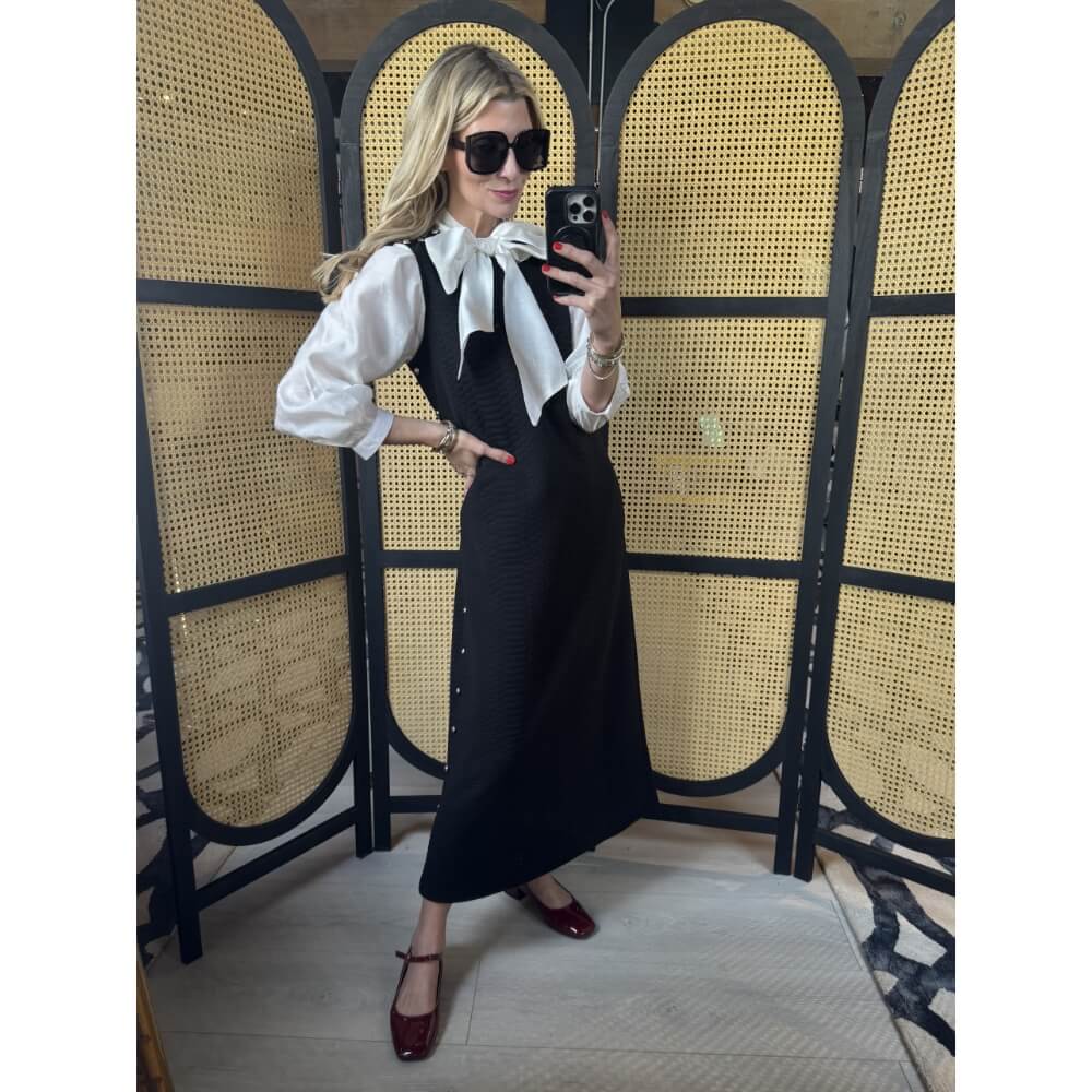 Classic black and white. So easy to pull together, but always stunning. Layer our Sheer White Big Bow Blouse under the Tea Length Jackie Dress and finish with the Patent Mary Janes.
