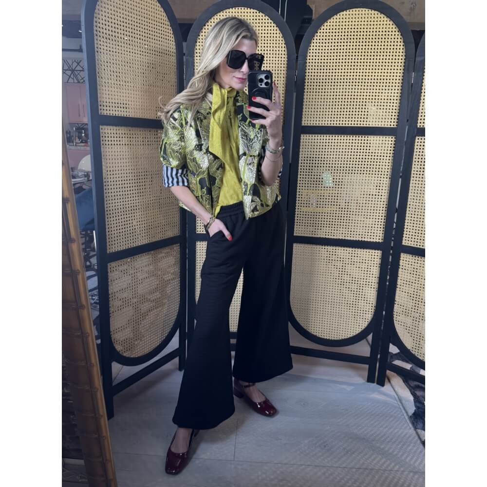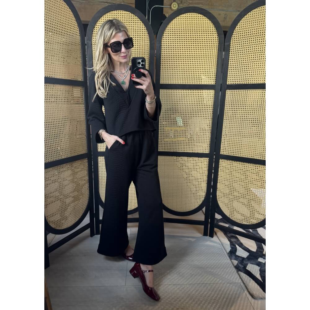 If Sleeveless isn't your style or you just need a warmer look, pair the Wide Leg Trousers with the matching Deep V Long Sleeve Mod Top. The cropped silhouette makes a flattering pair with the trousers. Easy black shades and Patent Mary Janes finish off this look.