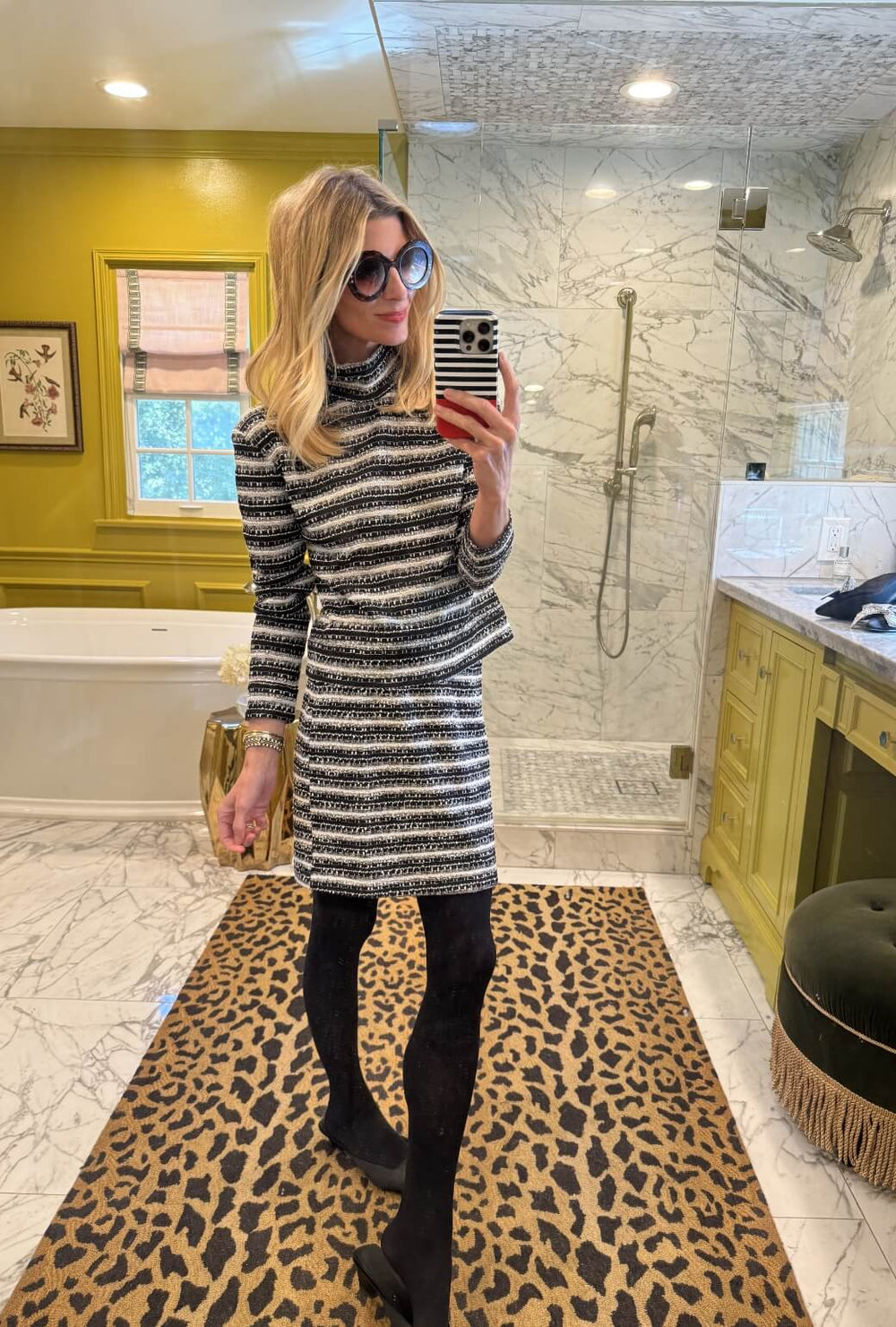 Head to toe in sparkles is our favorite winter style, and this combo is no exception. Our Diane Turtleneck and Pencil Mini in this twinkling bouclé is as comfortable as it is chic.