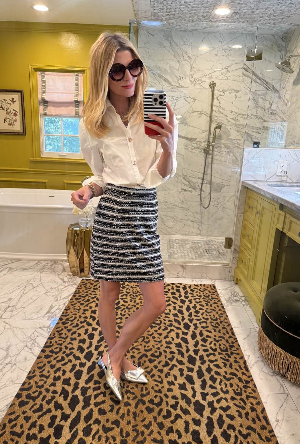 Timeless style with just the right amount of sparkle, the Brett Buttondown is the perfect topper for our Pencil Mini in black lurex bouclé. Roll the sleeves, pop the collar and you are out the door!
