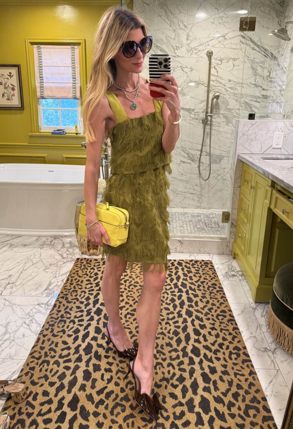Style the Moss Fringe Pencil Skirt with the matching Slim Top for a look full of whimsy and texture. Add the chartreuse Belmont worn as a clutch, sweetheart bow pumps, and oversized Audrey sunglasses for a playful, party-ready finish.