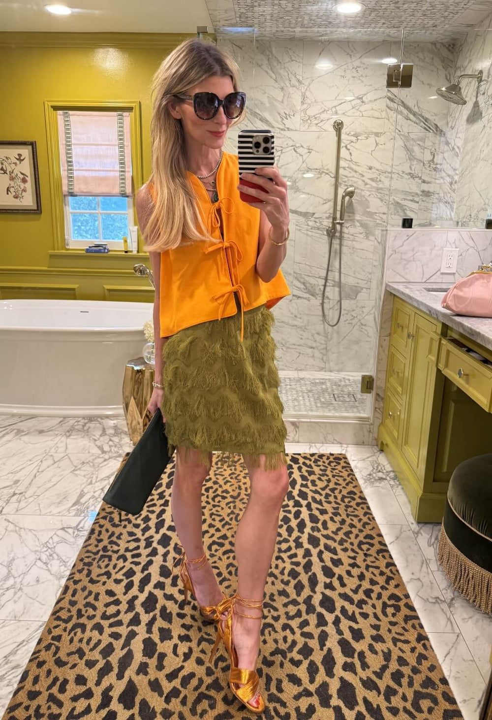 Take an outdoor-inspired turn with the Moss Fringe Pencil Skirt styled with our orange Fife vest for a bold, sporty twist. Finish with orange metallic heels for a look that feels adventurous, unexpected, and chic.