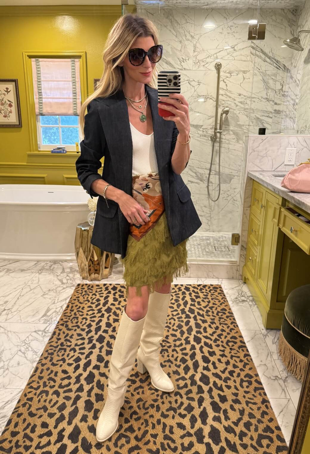 Style the Moss Fringe Pencil Skirt with our denim boyfriend blazer, white bodysuit, and faux croc white boots for a fresh, modern mix. Tie a vintage scarf around the waist for an unexpected pop that feels playful and styled.