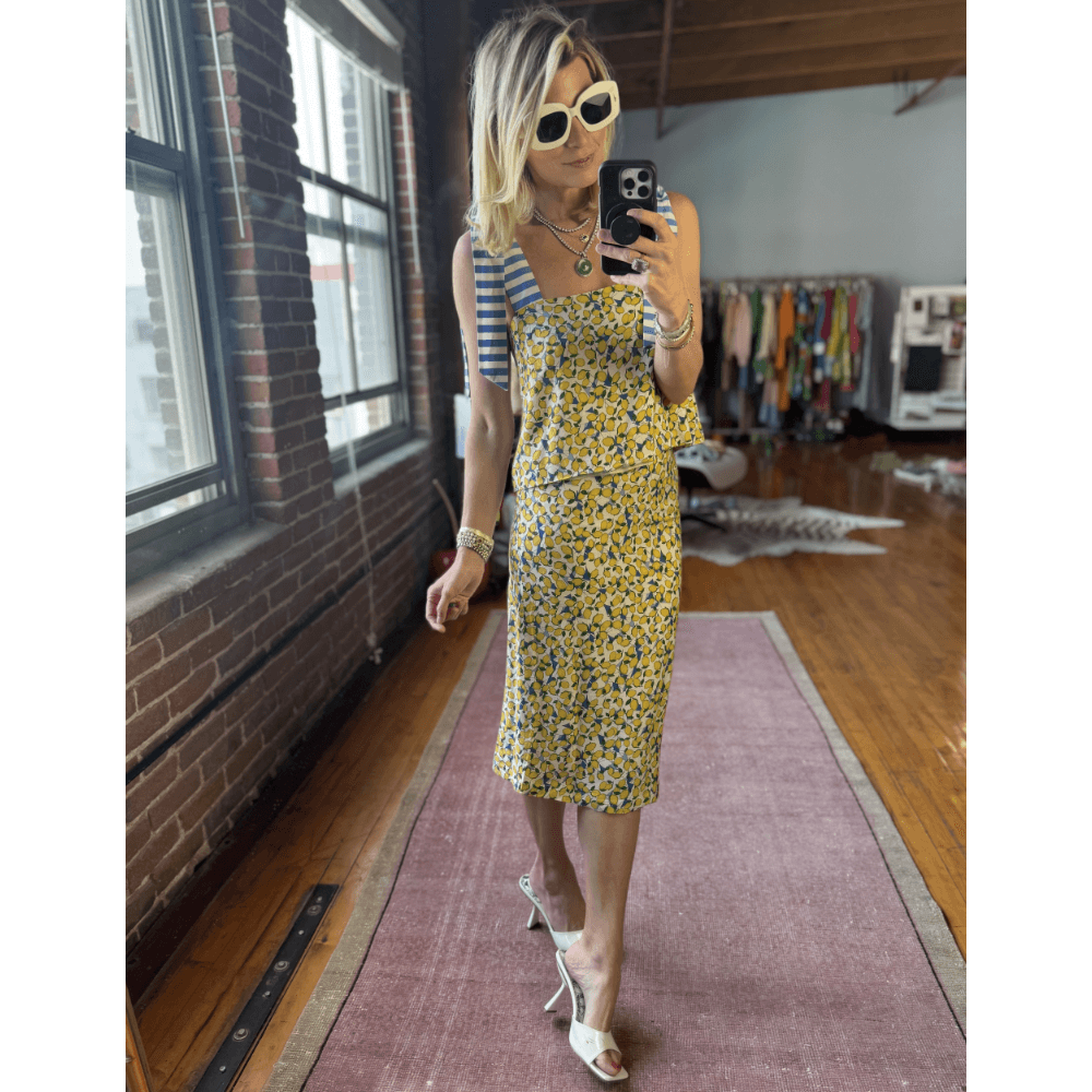 Love a matching set but prefer a skirt versus pants? Good news, we have a pencil skirt in this darling lemon print. A full tuck of the Bow Blouse keeps this elevated. And the cane belt defines the waist in a color coordinating way.