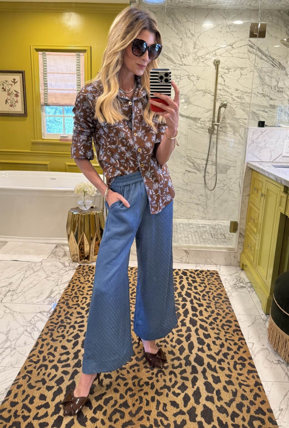 If you prefer to mix up the floral print, the cornflower blue Wide Leg Trousers make a great styling choice with the Perry Button Down. Add heels for an elevated look or loafers for an easy finish.