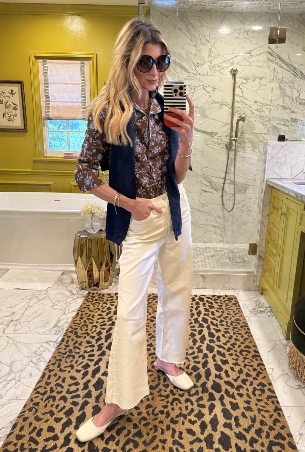 When you need more coverage, pop on our ivory Wide Leg Denim and a shoulder drape of our Olive Fringe Sweater - the print of the Perry Button Down pops when styled with these subtle pieces.