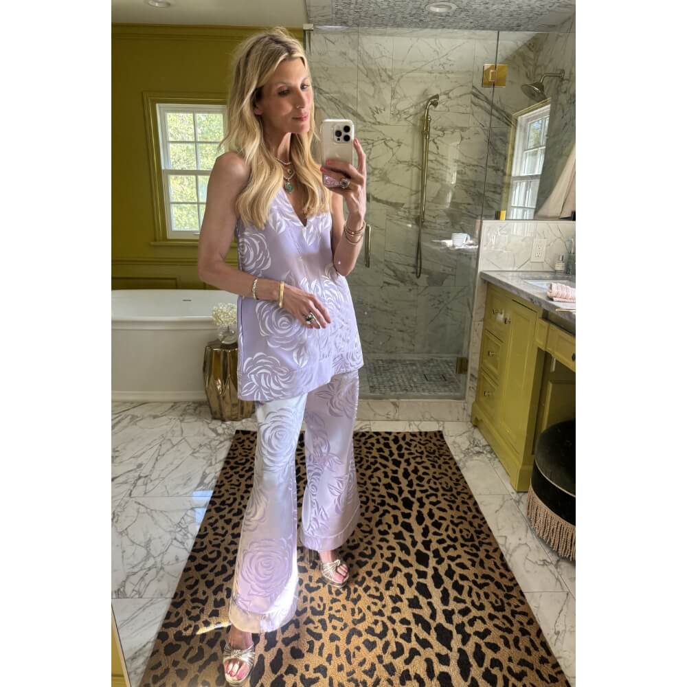 Our Run for the Roses Racer Tunic in lilac pairs effortlessly with her matching High Rise Trousers for a tonal moment that turns heads. Whether you're headed to the races or brunching in style, this look delivers elegance with a modern edge.