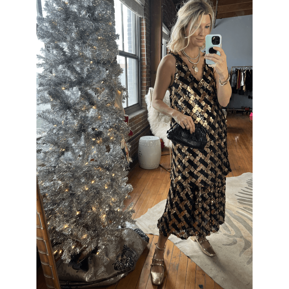 Every closet needs a go-to party skirt and we think this black and gold sequin option is the perfect fit. With an elastic waist, basket weave print and the perfect amount of shimmer, she'll help you party the night away in style, and comfort.