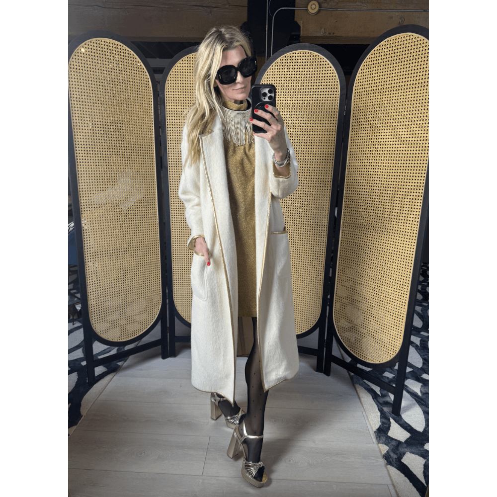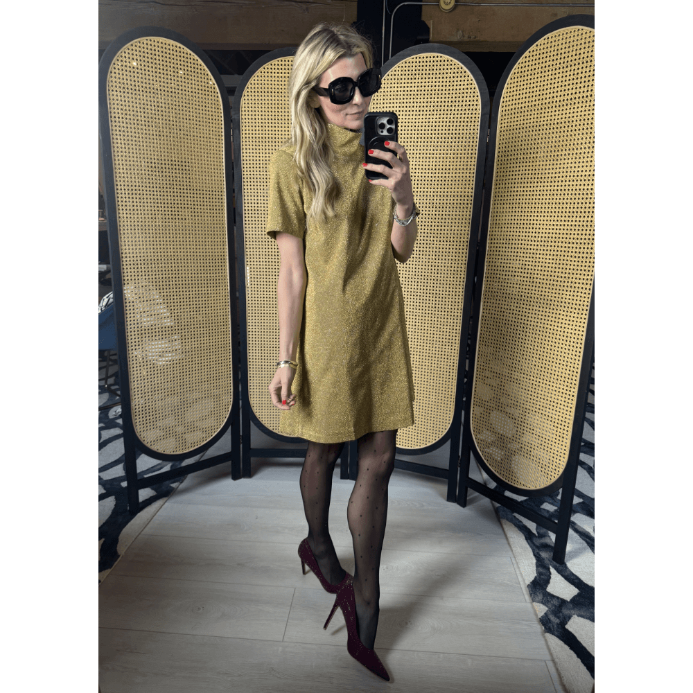 Our beloved Mod Dress is a staple silhouette in the BURU Library and we adore her as much as you do. But we decided she needed a little tweak...so we added a sleeve. Still chic with her A-line shift silhouette and perhaps a bit more retro with the new design, we hope you love her as much as the original. And with her gold sparkle textile, she's perfect for your next special occasion - NYE perhaps?
