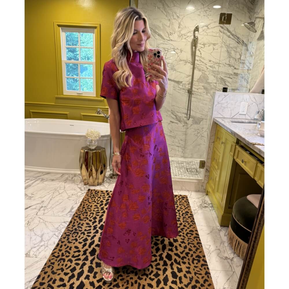 Everyone’s favorite Mod Top now comes with short sleeves and a bold update in vibrant Rani Pink brocade—combining modern charm with striking elegance. Pair it with the matching Rani Pink Tate Trousers, Laura Maxi or Laura Mini for a coordinated, head-turning look. She's also fab with the Rani Pink Satin trousers from the collection. Try dressing her down with denim for a chic take on casual sophistication.