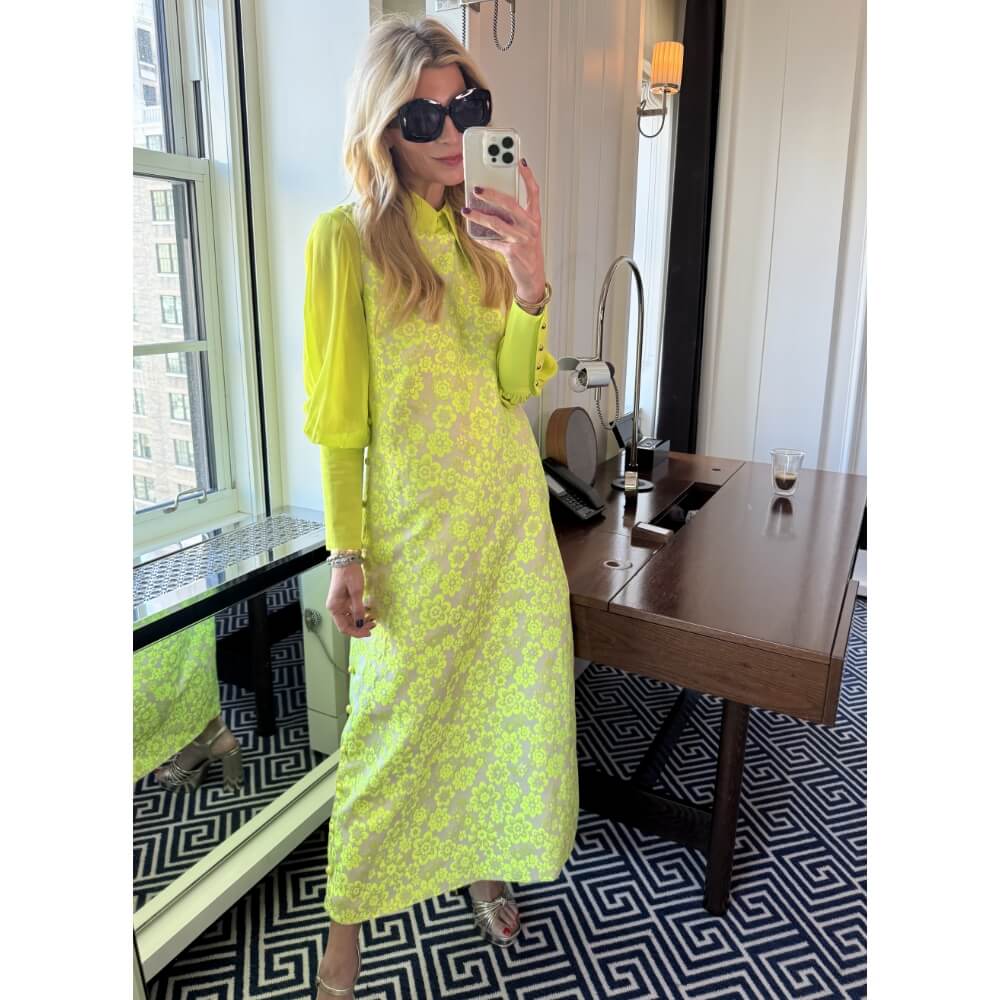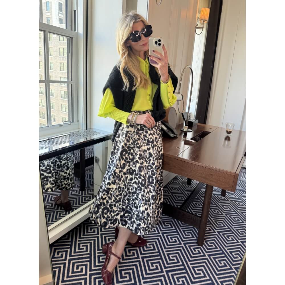 The neon lemon color of this blouse is the star of the show when paired with the neutral hues of black and ivory. This look is the epitome of transitional style. And we love the pop of contrast color with our go-with-everything Mary Jane's.