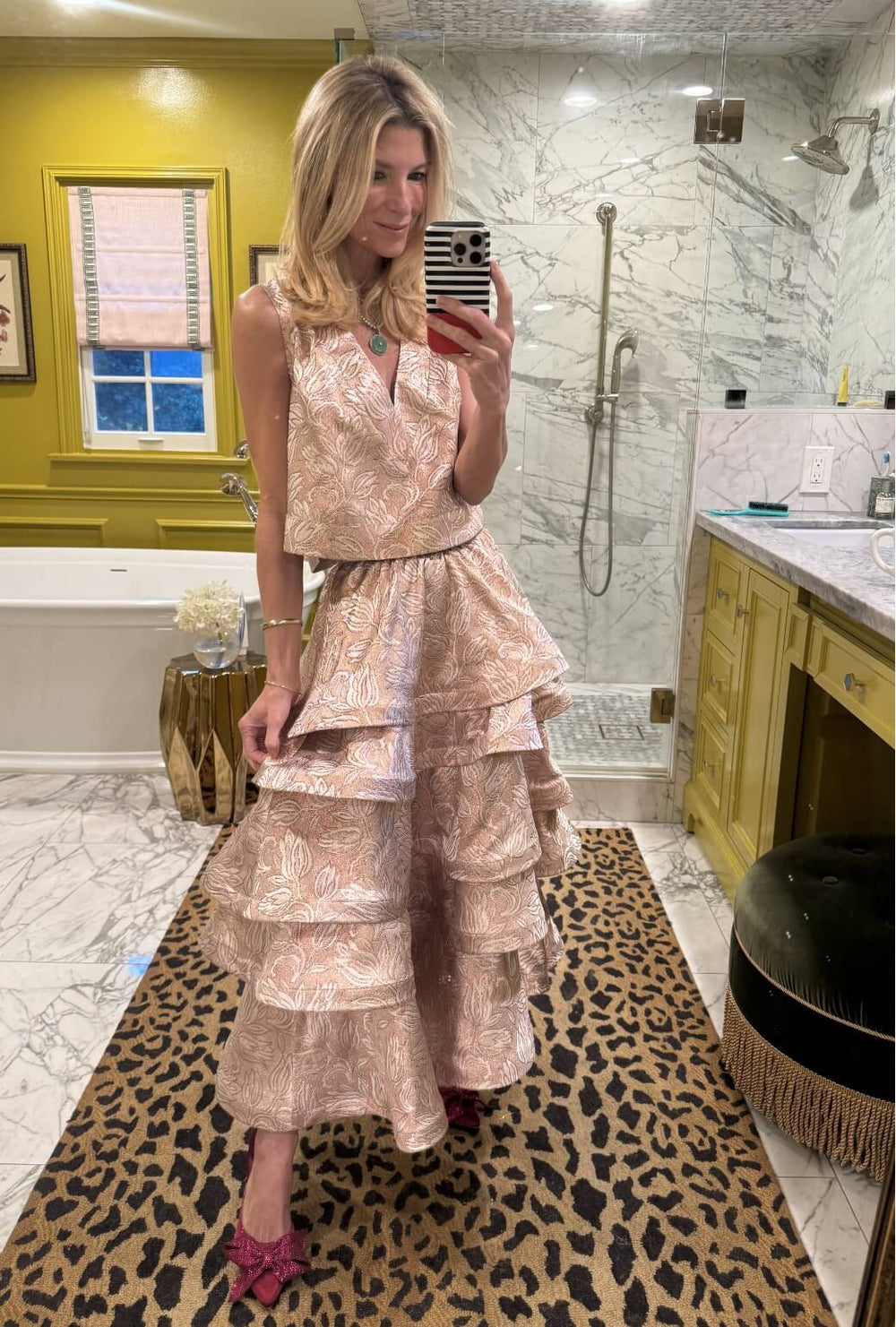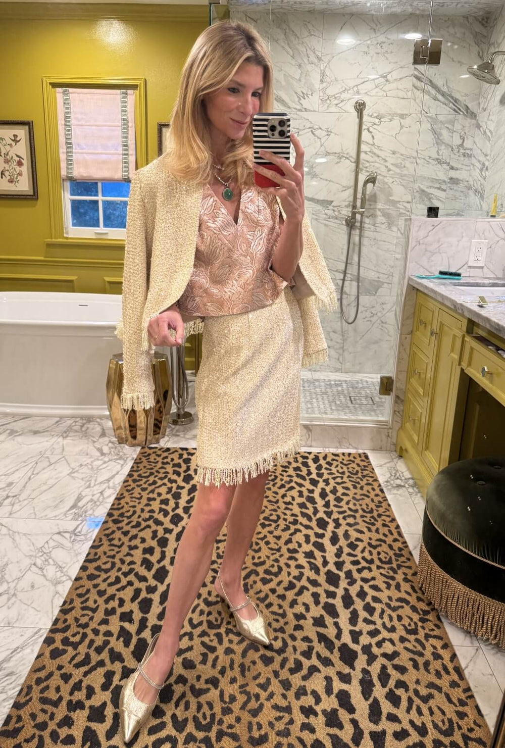 This Gold Lamé Tulip Deep V Mod Top adds a chic shimmer under the Ivory Twinkle Tweed Mona Lee Blazer and matching mini for a polished, party ready set. Complete the look with a metallic shoe to keep the shine going from head to toe.