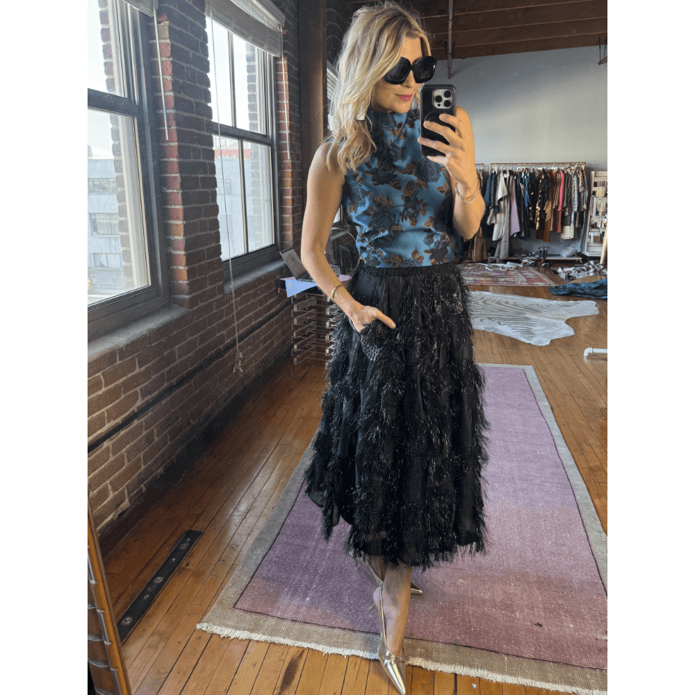 To change up the look of our Sleeveless Mod Top, you can leave one or two buttons undone in the back to create a "tail" that then can be tied up for a cinched waist. Then pair it with your favorite pant or skirt (seen here with our Black Eyelash Skirt) for a sleek silhouette.