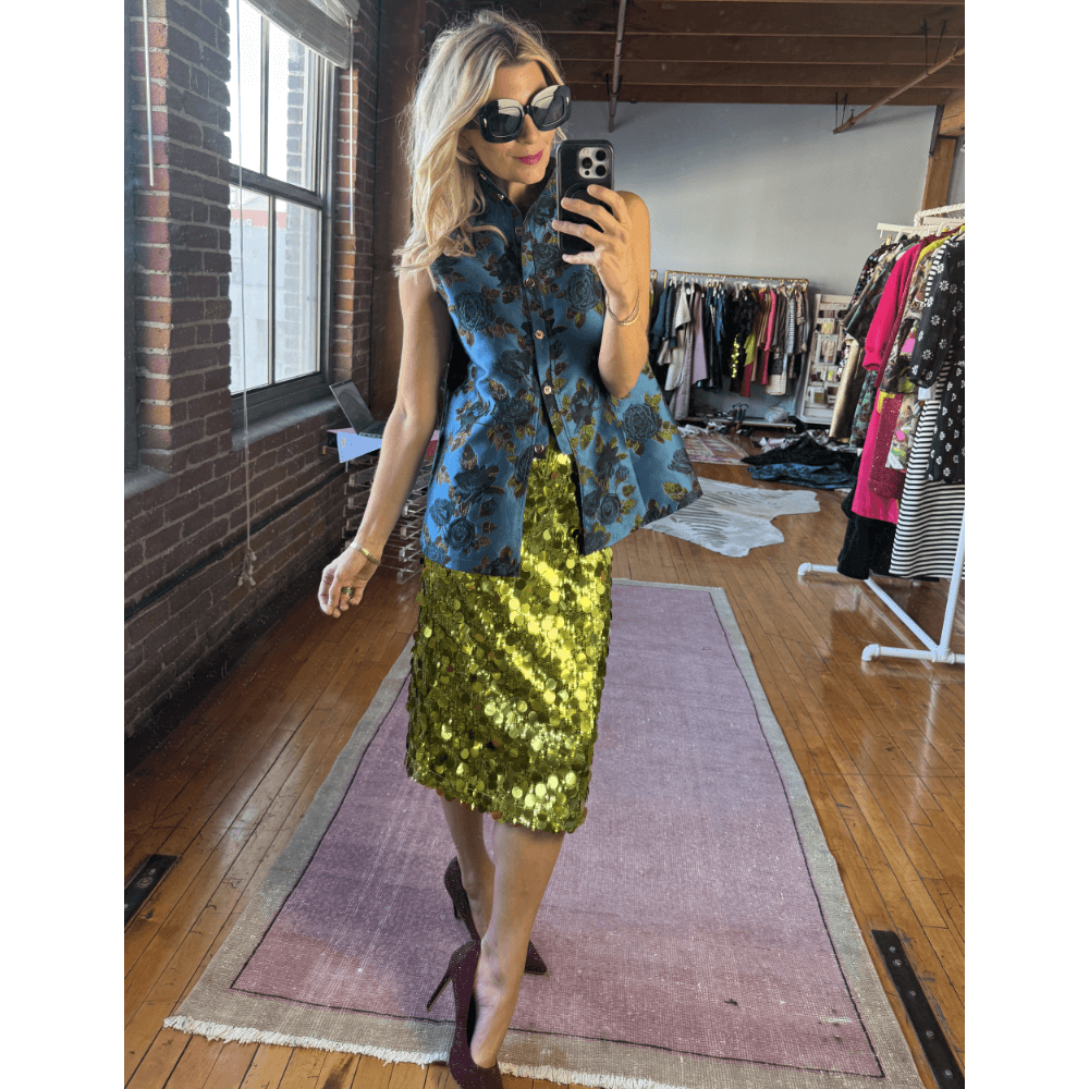 Find new ways to wear the pieces that you love. For example, our Sleeveless Mod Top silhouette, when turned around to "side B" has an interesting asymmetrical hemline - made especially obvious by the pop-of-color sequins.