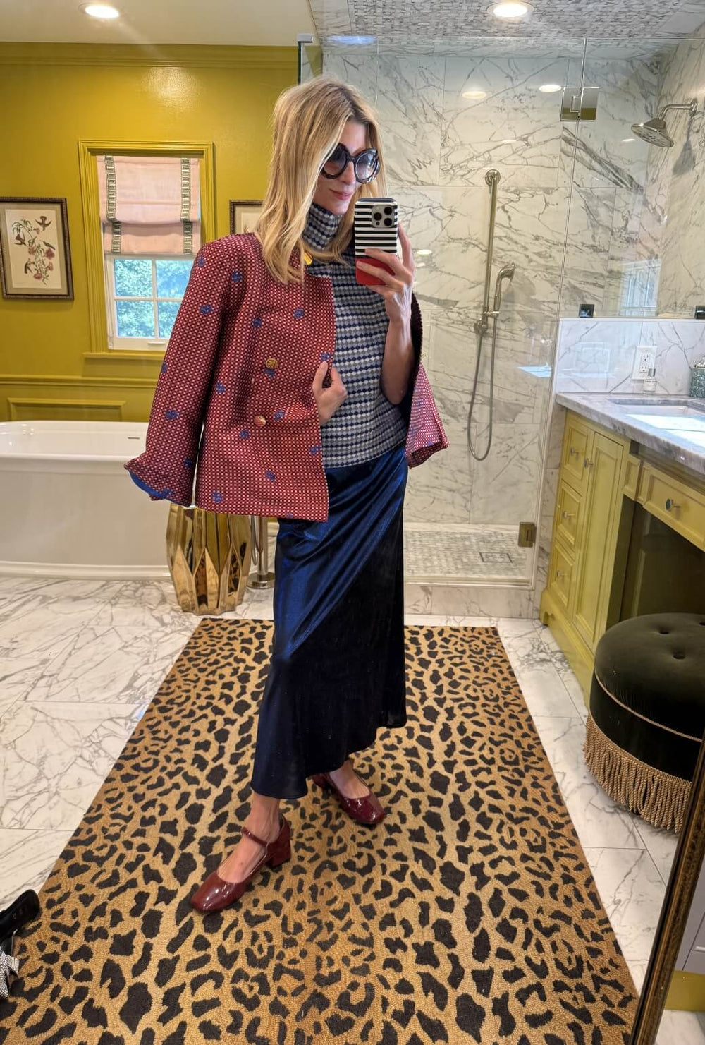 This Cobalt Lurex Slip Dress offers endless wears, shining on its own or layered with the blue diamond turtleneck for a sleek, cool-weather moment. Top it with the Gingham et Rose Swell Jacket to add texture and charm, instantly transforming the look for day or night.
