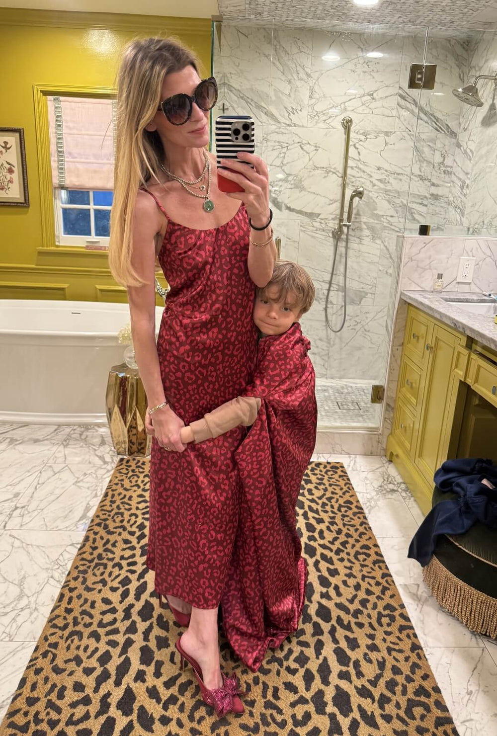 Styled solo, with the matching Caselotti Cape for Morgan's tiny superhero sidekick, our slip dress in pink leopard satin can take you from a day at the park with sneakers to an evening out with stilettos. Versatile and classic.
