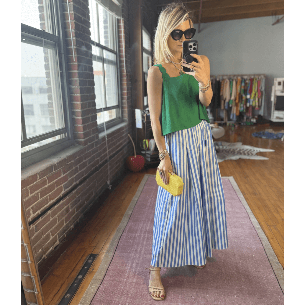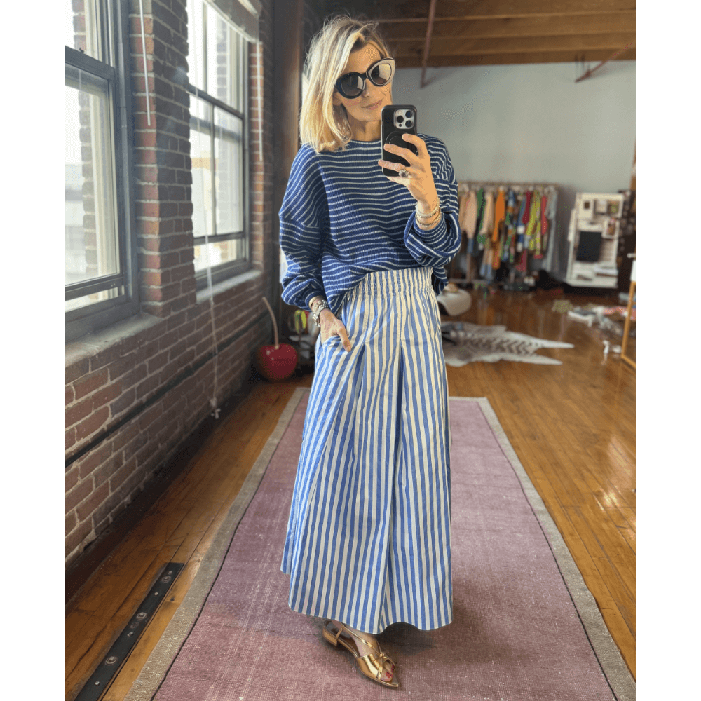 When comfort and class collide, it's instant "style magic". This smocked waist midi skirt is as pretty as it is practical. In a classic blue and white stripe with pockets and pretty pleats, this easy, everyday skirt, that hits above the ankle, dresses up with heels and down with sandals. Oh, and did we mention she has a coordinating top? Pair her with the Limoncello Pillar Top for a whimsy ensemble.
