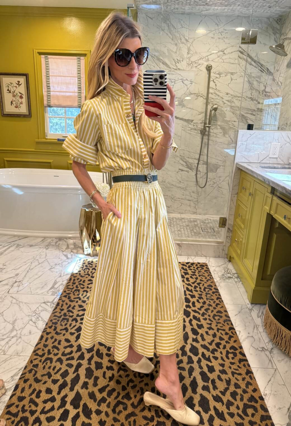 This smocked-waist midi skirt in citron stripe is as pretty as it is practical. Designed with a contrast hem and soft pleats, she dresses up with heels, down with sandals, and stays breezy on warm days thanks to her unlined finish. Pair her with the our matching Mel Mixed Button Down for effortless, everyday style.
