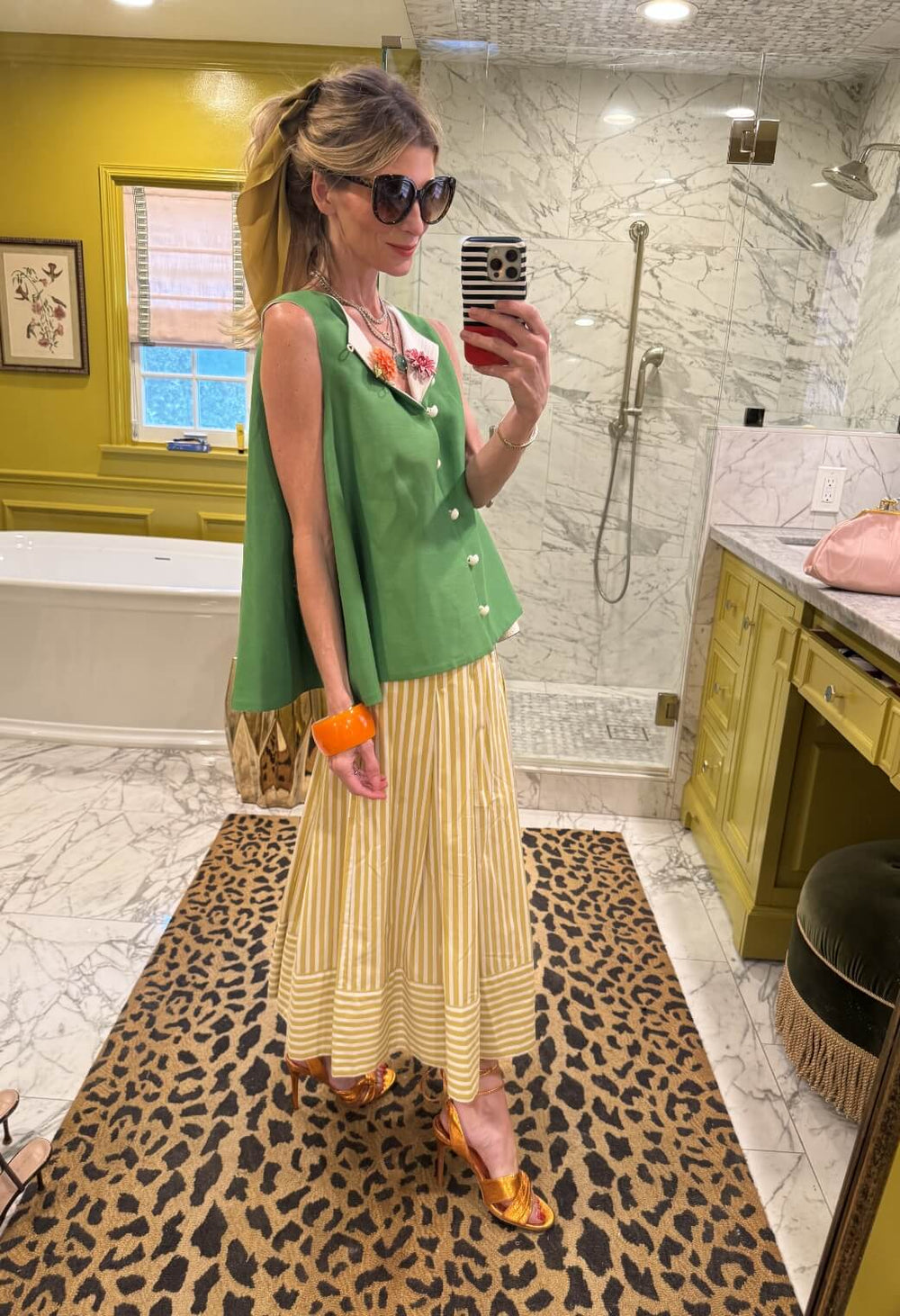 Change the silhouette by styling with our green swing top, a vintage scarf, and big sunnies, stack a bold bangle, and step out in metallic heels. Play up the citron color palette with pops of green, citron, and orange for a look that feels joyful and delightfully Buru.