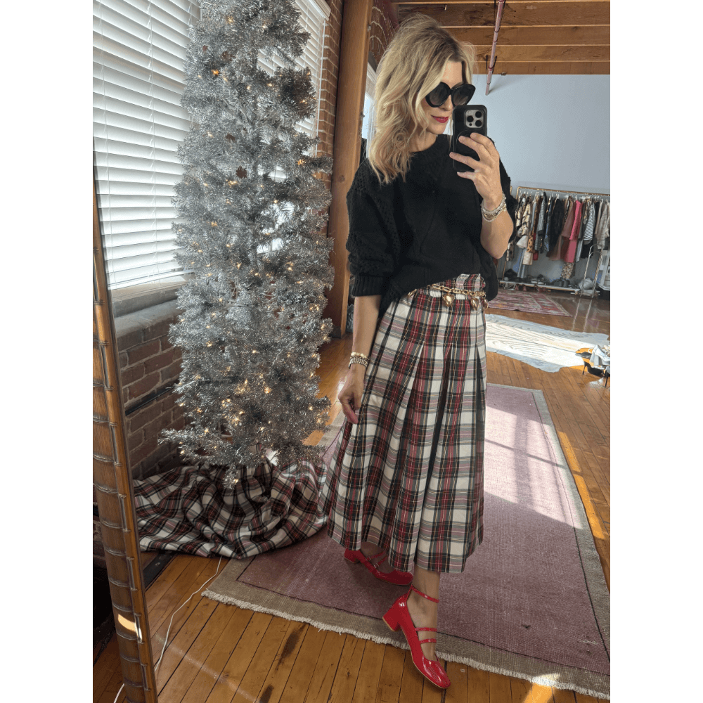 Prefer to break up the plaid? Add the Fisherman Sweater in black, with a slight front tuck, for an easy Holiday look. The red Mary Janes and Chain of Hearts belt keep it festive.