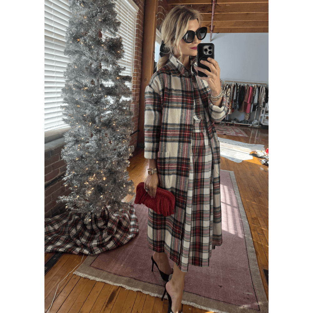If Holiday weather calls for a heavy coat, pop on our Open Car Coat in dress stewart plaid with the matching Mod Top and Smocked Waist Skirt. This beaded clutch in bold red adds the perfect dressy touch.