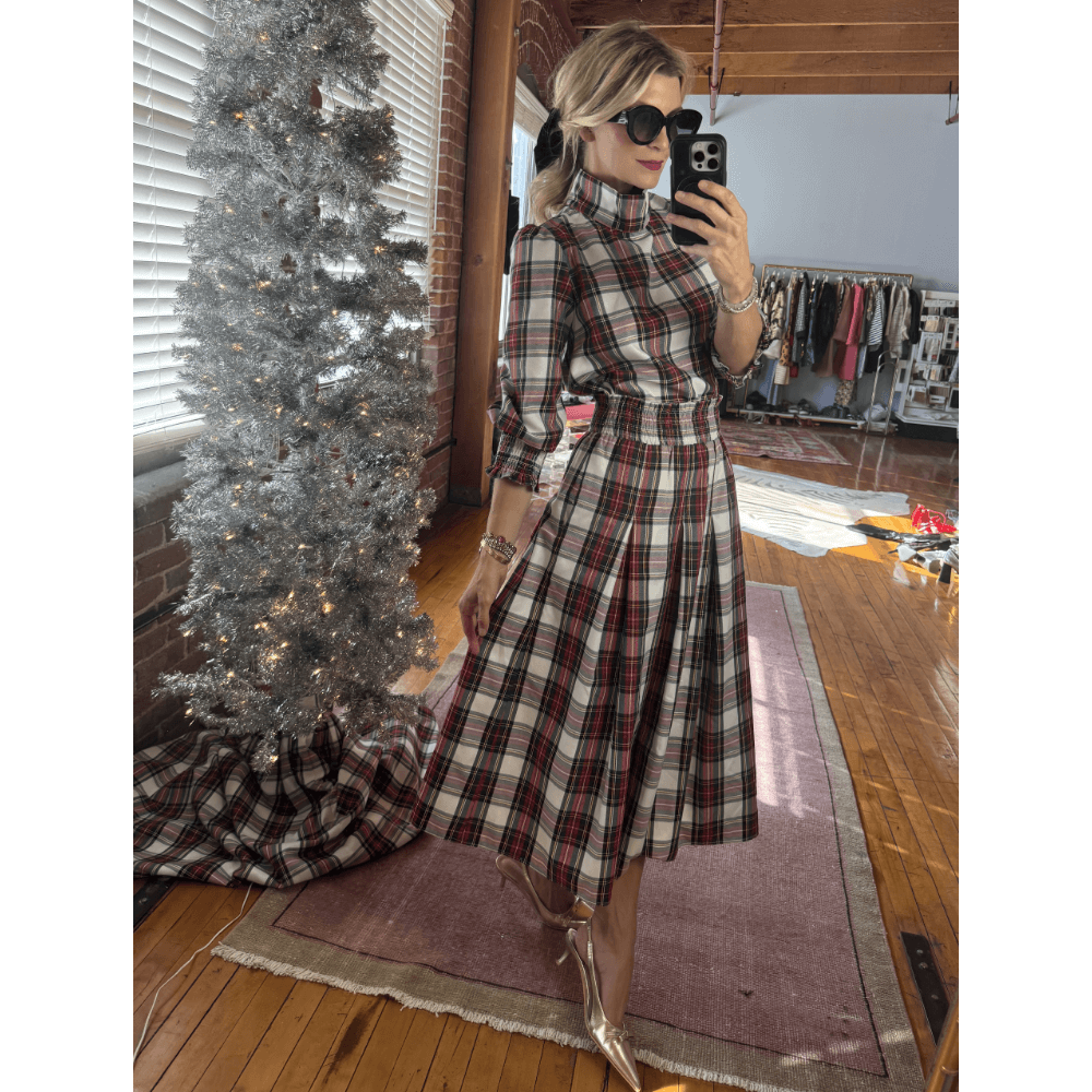 When comfort and class collide, it's instant "style magic". This smocked waist midi skirt is as pretty as it is practical. With a comfortable smocked waist, pockets and pretty pleats, this easy, everyday midi skirt in class Dress Stewart Plaid is perfect for both dressed up and dressed down holiday affairs. Pair with the matching Long Sleeve Mod Top for a fully festive look.