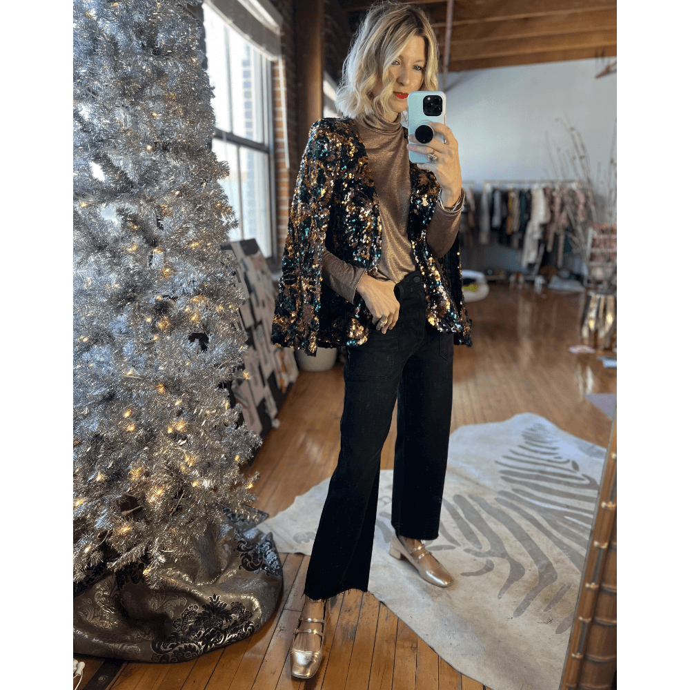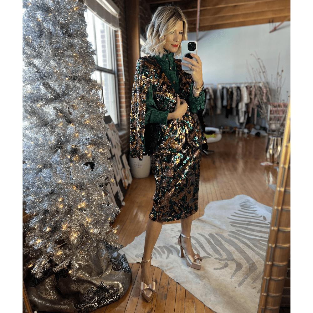 Quite possibly the easiest way to add a little glitz...our Sparkle Cape! Made of the most unique mix of metallic green, gold, silver and mauve sequins, and lined with our emerald floral textile, it is a great way to elevate your holiday style! Pair with the matching pencil skirt for full glamour, or pop it on over the Emerald Everyday Pant and Long Sleeve Mod Top for a totally different look. This piece is sure to become your most festive throw on & go!