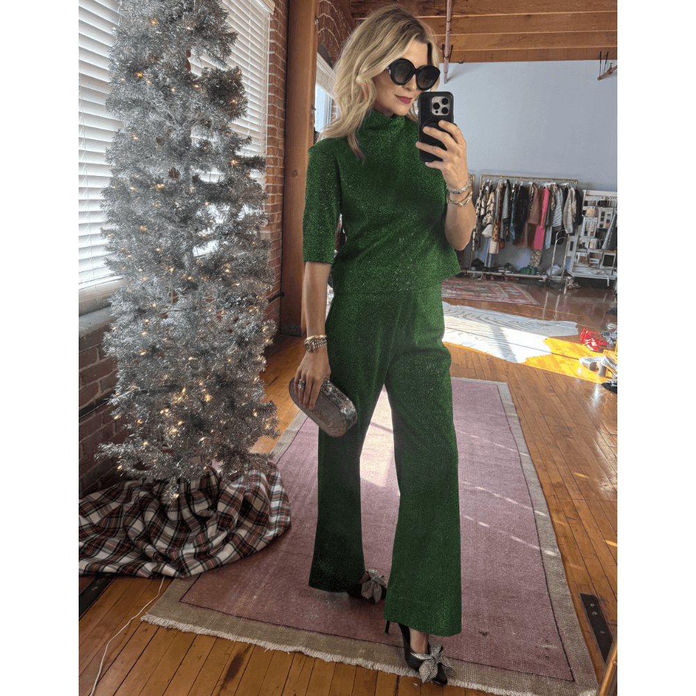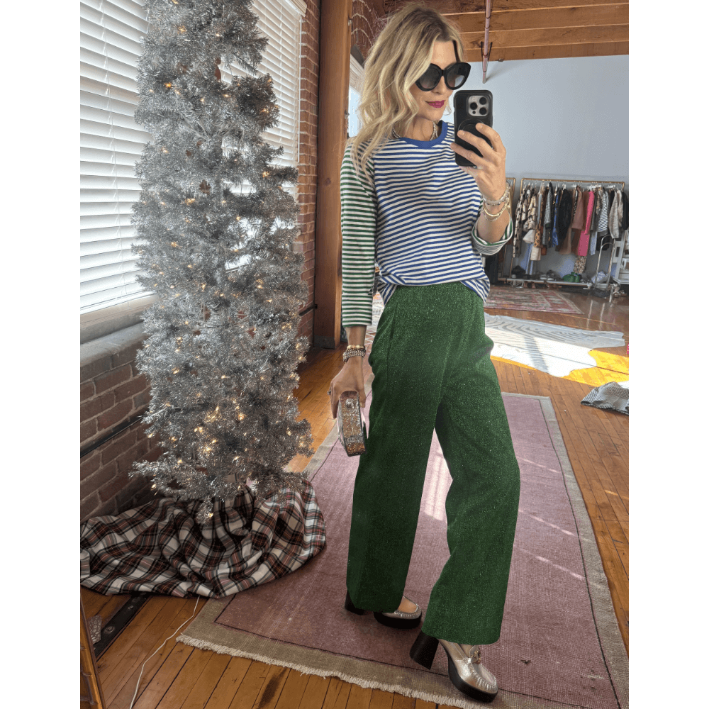 Since introducing our Le Culottes in 2023 we've fallen in love with the fit and versatility of the silhouette. In fact, we are so in love, we decided to introduce them as a full-length pant! So... while they aren't technically a culotte, we kept the name intact to make sure it was obvious that the fit was the same with just added length. The same elastic back waist, flat front and pockets that you love, just now in a full-length style. And do not sleep on them in this green sparkle textile! This cocktail ready look just happens to be beyond comfortable. We can't think of anything better during the busy holiday season!